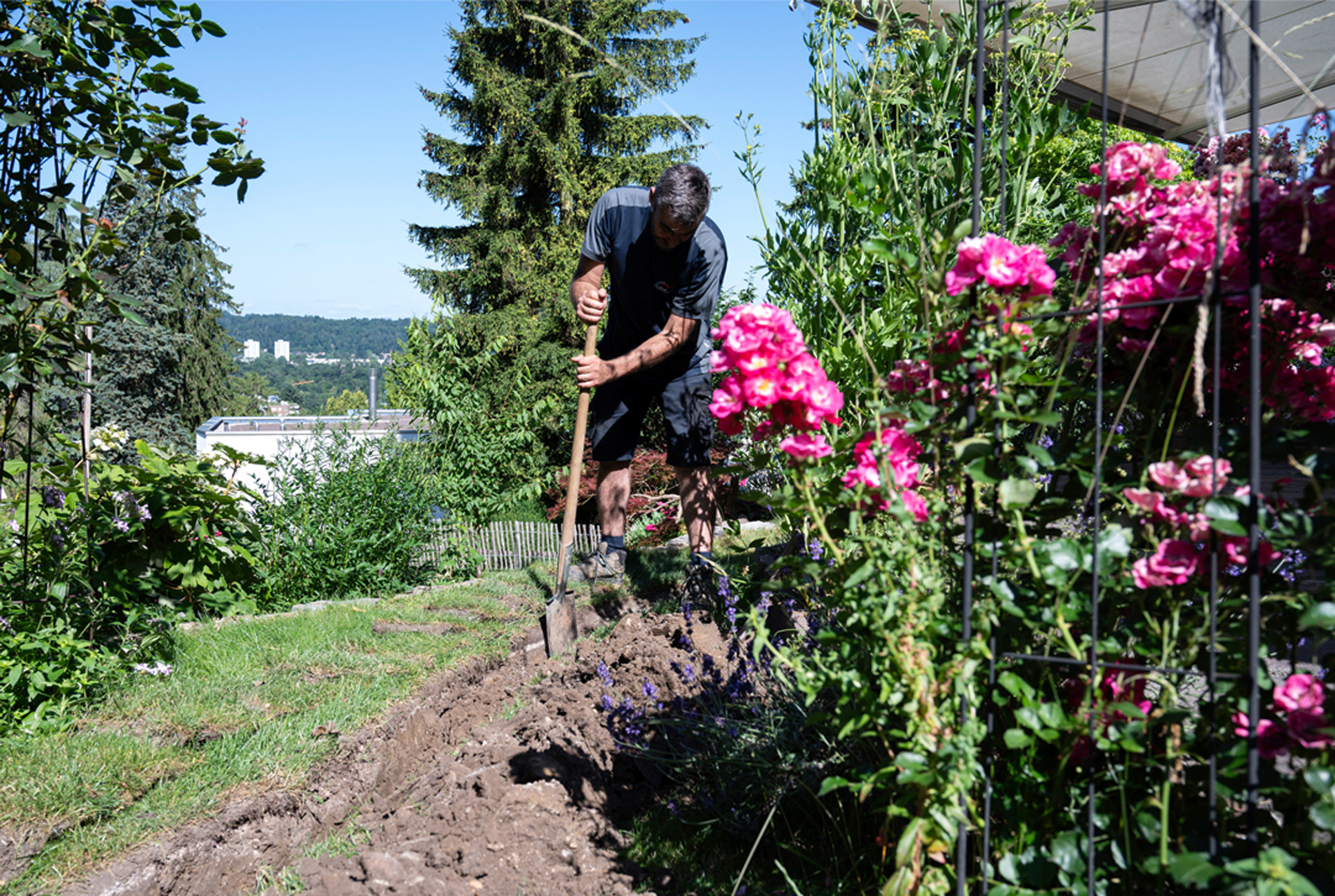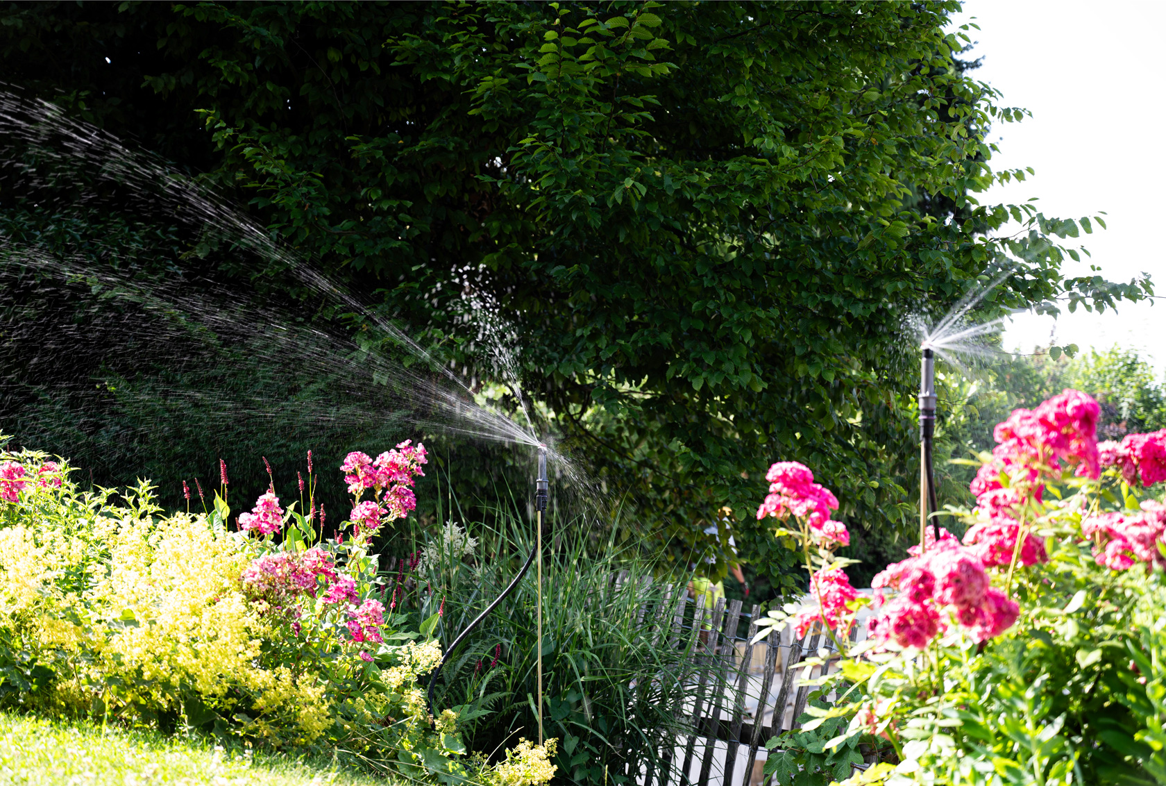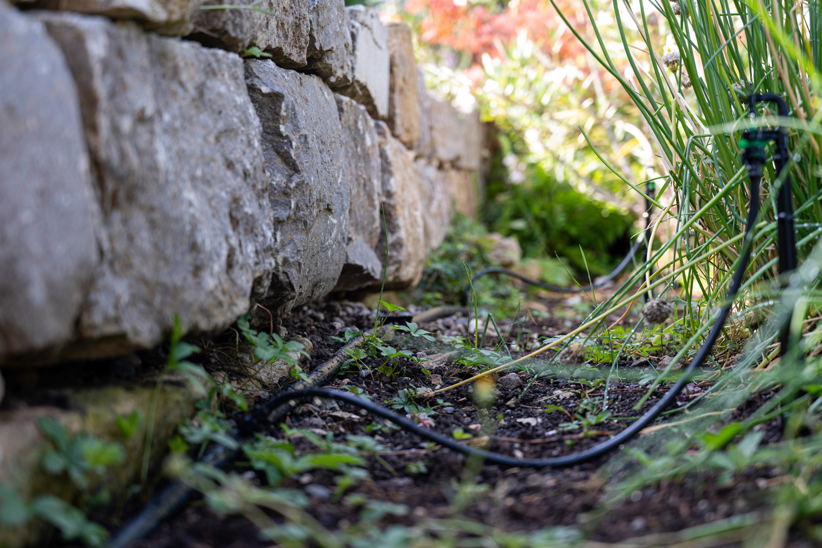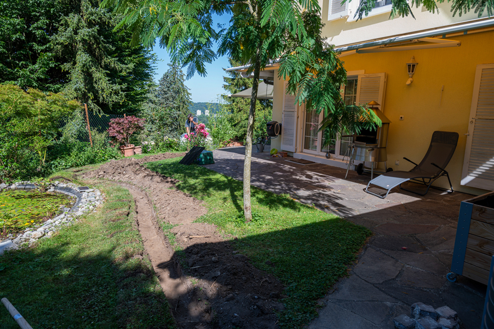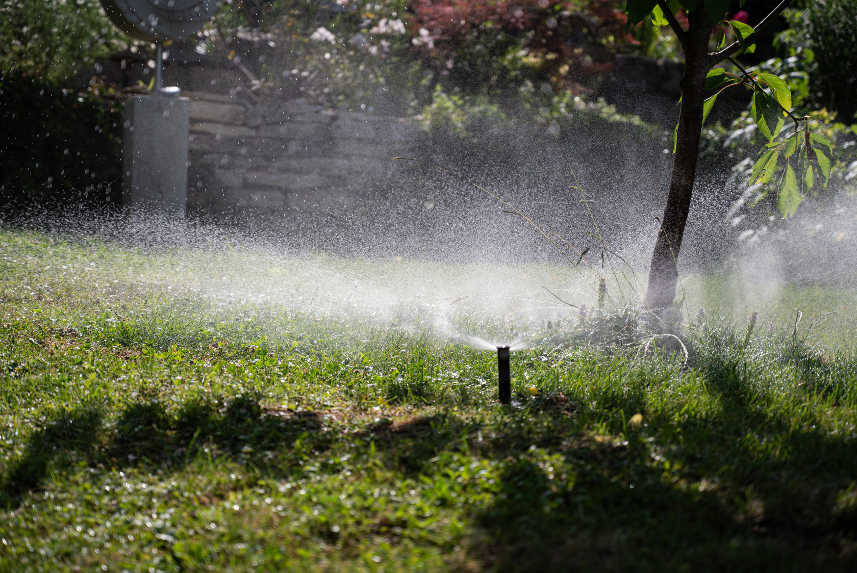 Wie gewünscht haben wir eine grosse Regentonne zur Rückhaltung von Dachwasser installiert, die auch manuell mit der Giesskanne genutzt werden kann. Gleichzeitig wurde für die Wasserreinhaltung im vorhandenen Teich eine Umwälzpumpe installiert. Schliesslich haben wir das ganze System mit einer vollautomatischen Bewässerung – des Herstellers Hunter – für Rasen und Beete komplettiert. Ein weitverzweigtes Netz von Zuleitungen, Tropfschläuchen sowie zielgenau positionierten Sprühdüsen bewässert jetzt den Garten mit Regen- und Frischwasser sparsam und hoch effizient mit optimiertem Wasserverbrauch.