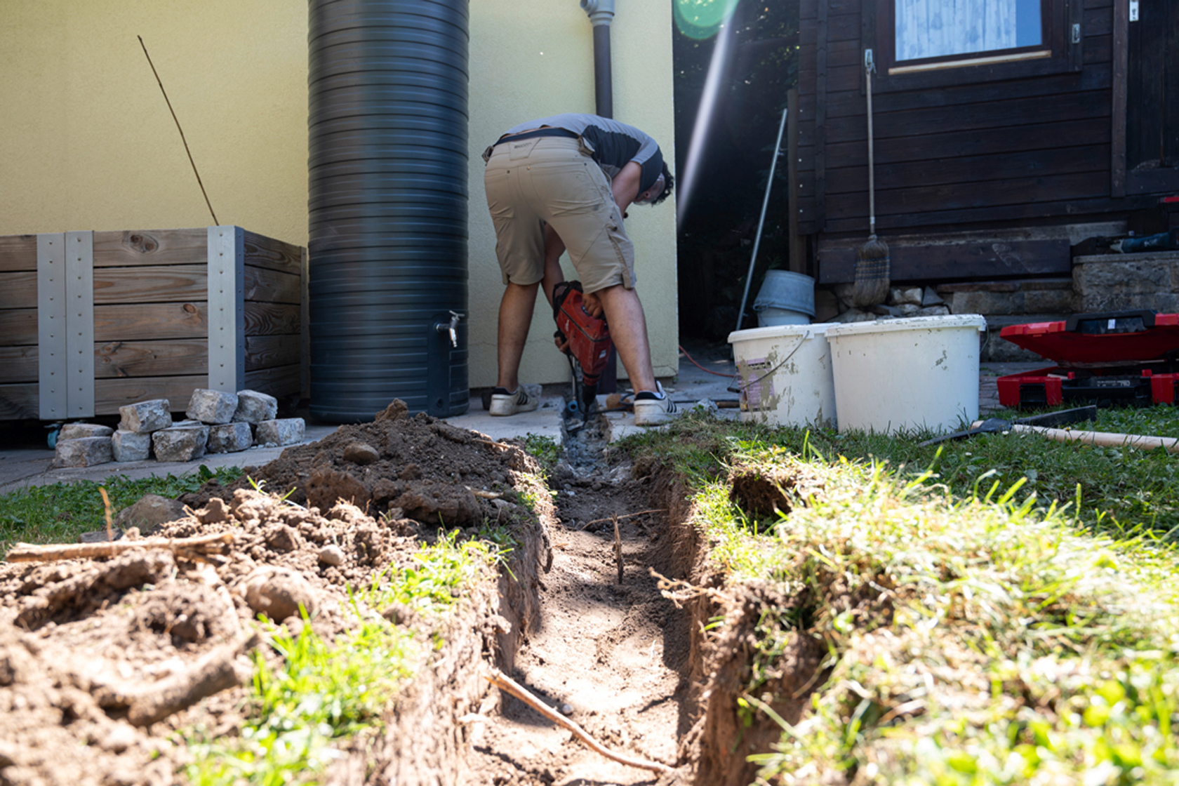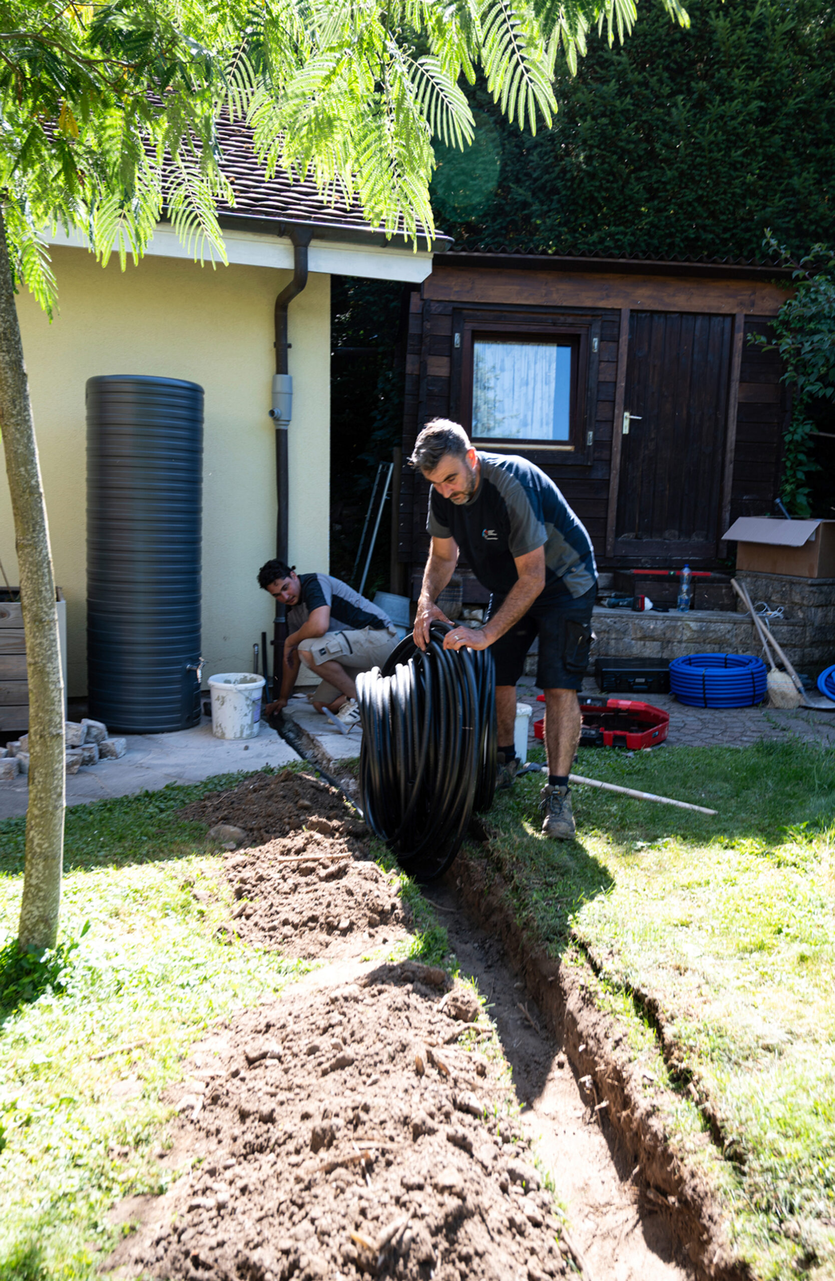 Unser Kunde hatte bei uns zuerst einmal eine Regenwassertonne und Möglichkeiten zur Rasenbewässerung angefragt. Im Rahmen eines Vorort-Termins waren wir schnell mit der Bauherrschaft einig: eine nachhaltig umfassende Lösung trägt langfristig kostengünstig und sicher in die Zukunft. Oder anders ausgedrückt – wir haben das Thema «ganzheitlich» betrachtet und geplant – und dann in enger Abstimmung mit der Bauherrschaft umgesetzt.