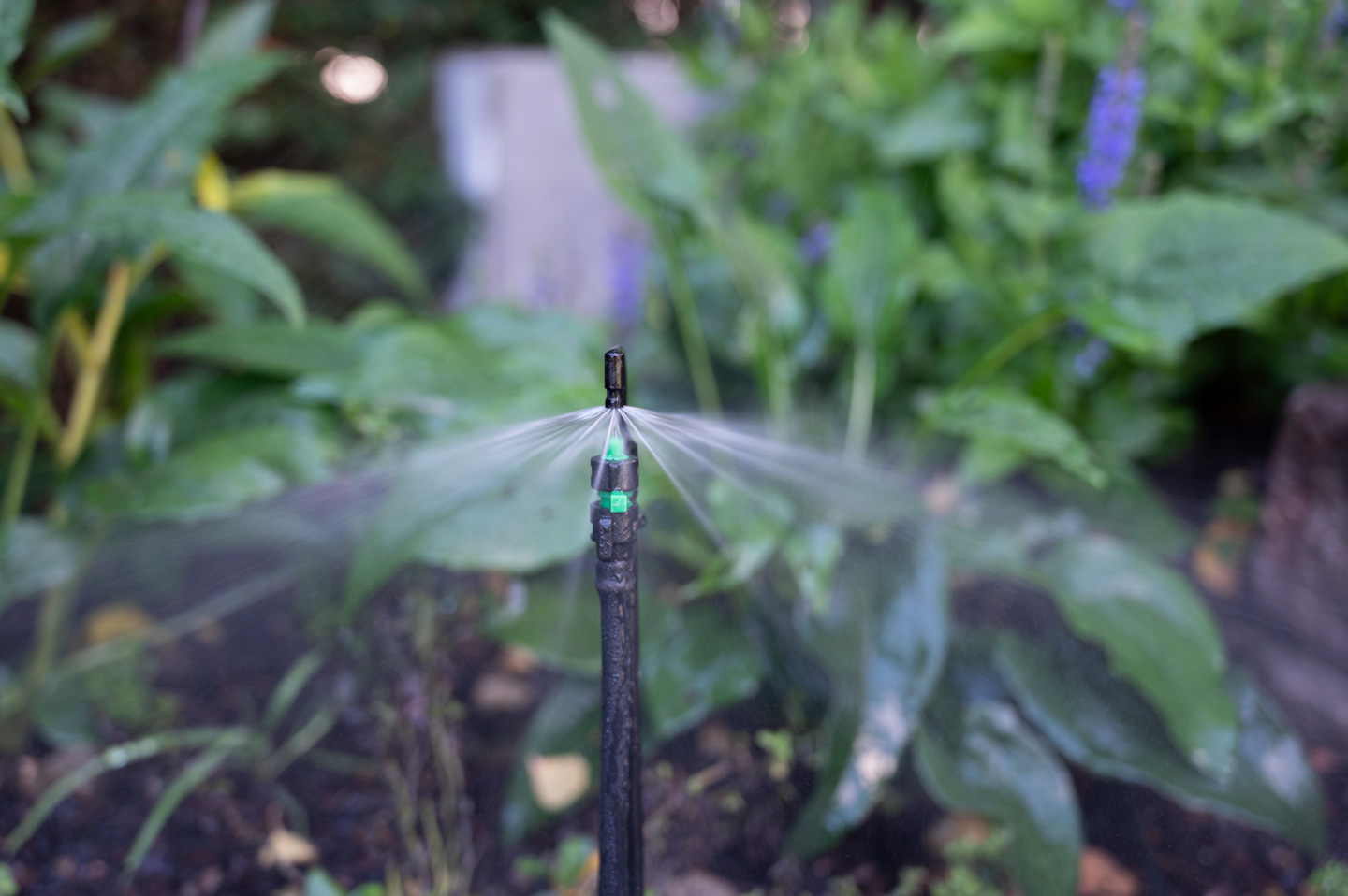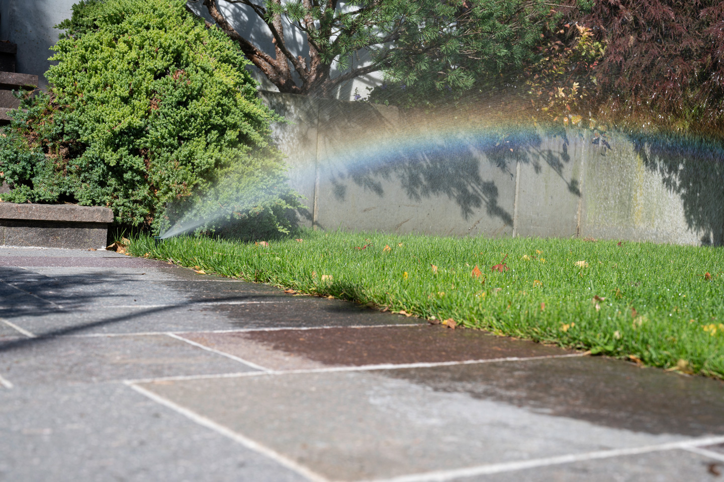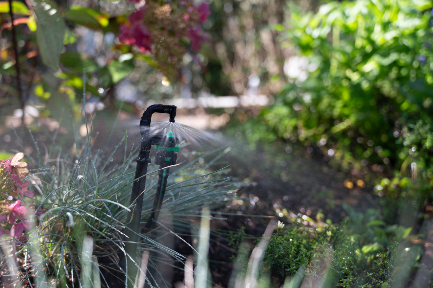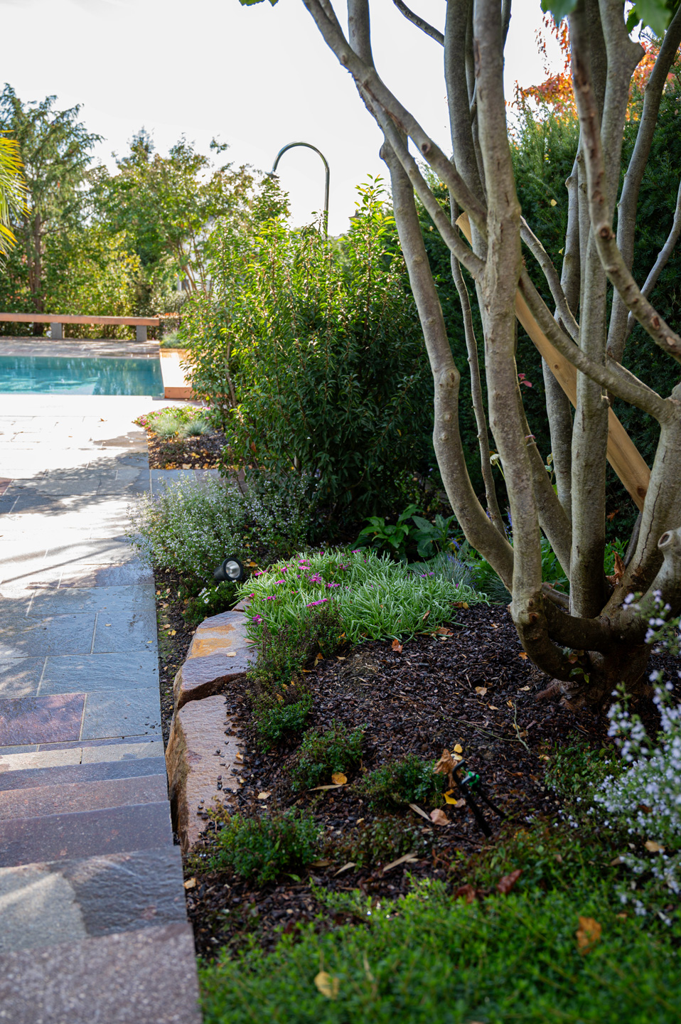 Ein weit verzweigtes Netz von Tropfschläuchen, Regnern und Rasen-Sprenklern bewässert Rabatten, Hecken, diverse Garten- und Grünflächen sowie den Rasen. Eine automatische Steuerungseinheit mit Regensensor von unserem Partner Hunter Bewässerungstechnik regelt dabei die zielgerichtete und auf die jeweilige Pflanzung angepasste Bewässerung. Das bedeutet optimalen Ressourceneinsatz und gewährleistet langfristige und nachhaltige Freude an der wunderbaren Gartenlandschaft, die in diesem Garten rund um Pool und Aussichtsterrasse entstanden ist.